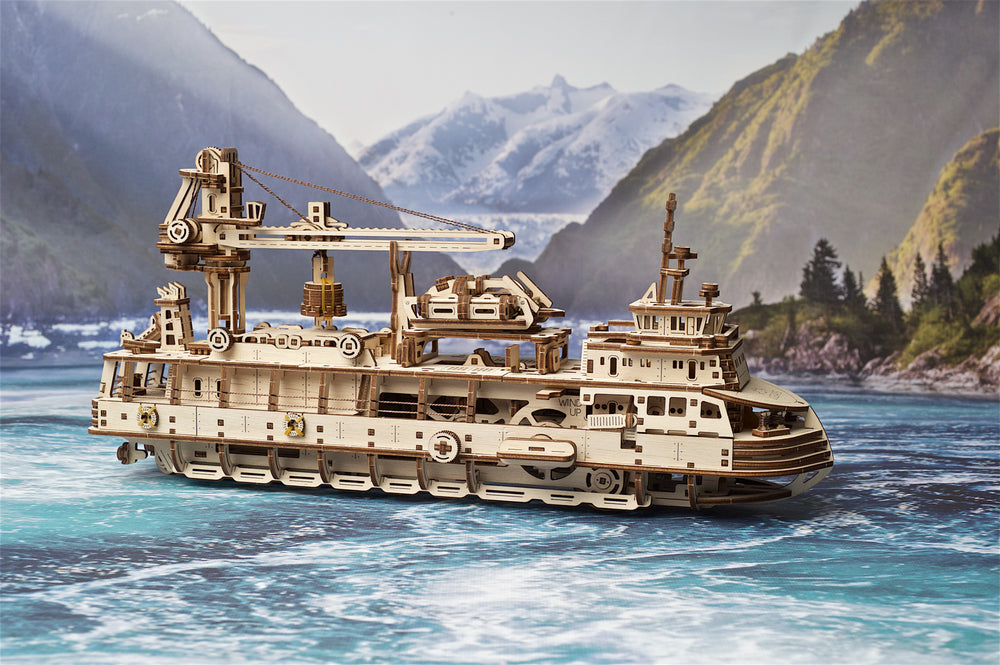 As a tribute to and based on the research trip, the brand manufacturer UGEARS has launched the research ship model kit and once again proves its keen eye for detail with this innovation. The kit, which consists of a total of 575 individual parts, can be taken from a prefabricated template and assembled without glue. In addition to a bathyscaphe submarine for exploring the deep sea, the ship model has a ramp and a lifeboat so that the exploration of the sea can be started with the necessary safety and research equipment. In this context, the crane should not be missing, which in turn pulls the bathyscaphe submarine out of the water and places it on a special platform. A rubber drive is used to drive the marine research ship, which is supplied with the appropriate thrust energy by a rubber motor. The ship's hull can also be maneuvered and steered using a lever. Modeled after the retro-futuristic design of steampunk, every ship movement can be tracked in detail, so that the mechanics come to the fore in addition to the artful model building. The individual parts of the research ship are also made of environmentally friendly materials..