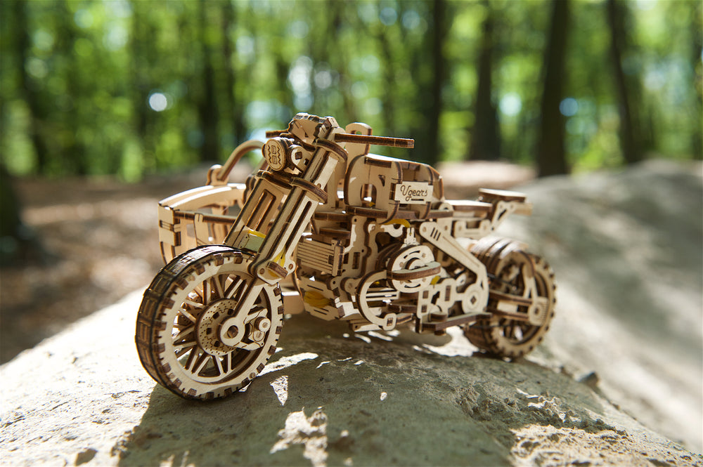 That IUGEARS®, one of the most famous manufacturers of wooden models in steampunk style, is now dedicating itself to this collector's item of the motorcycle scene, is no coincidence. One look is enough and the motorcycles, which are also similar to a custom bike, become monuments made of wooden puzzle pieces. There is no doubt that this wooden construction, consisting of a total of 380 components, deserves a place in the showcase of every motorcycle and model building enthusiast. The individual parts, laser-cut and made from sustainable wood, do not require any glue and are therefore designed to be suitable for children. As a result, this novelty addresses the family project education and this in several ways.