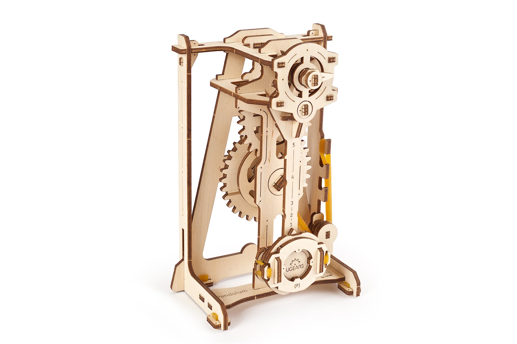 The pendulum is a stylized construction model, an interactive study guide for the mechanism with the purpose of learning its basics and principles of work. The pendulum is one of the most basic and most reliable timing mechanisms. The working principle is based on the constant amplitude oscillation of the model under the gravitational weight and potential energy tensile force of the rubber band. The elastic band supplies the model's mechanism and compensates for the loss of kinetic energyust of the pendulum. The device is animated by means of a gear with a winding wheel.