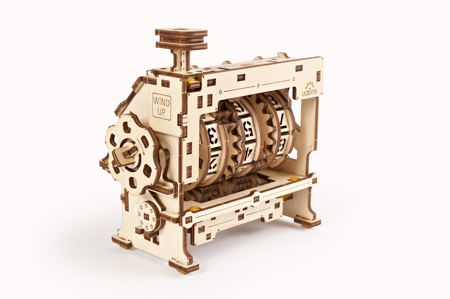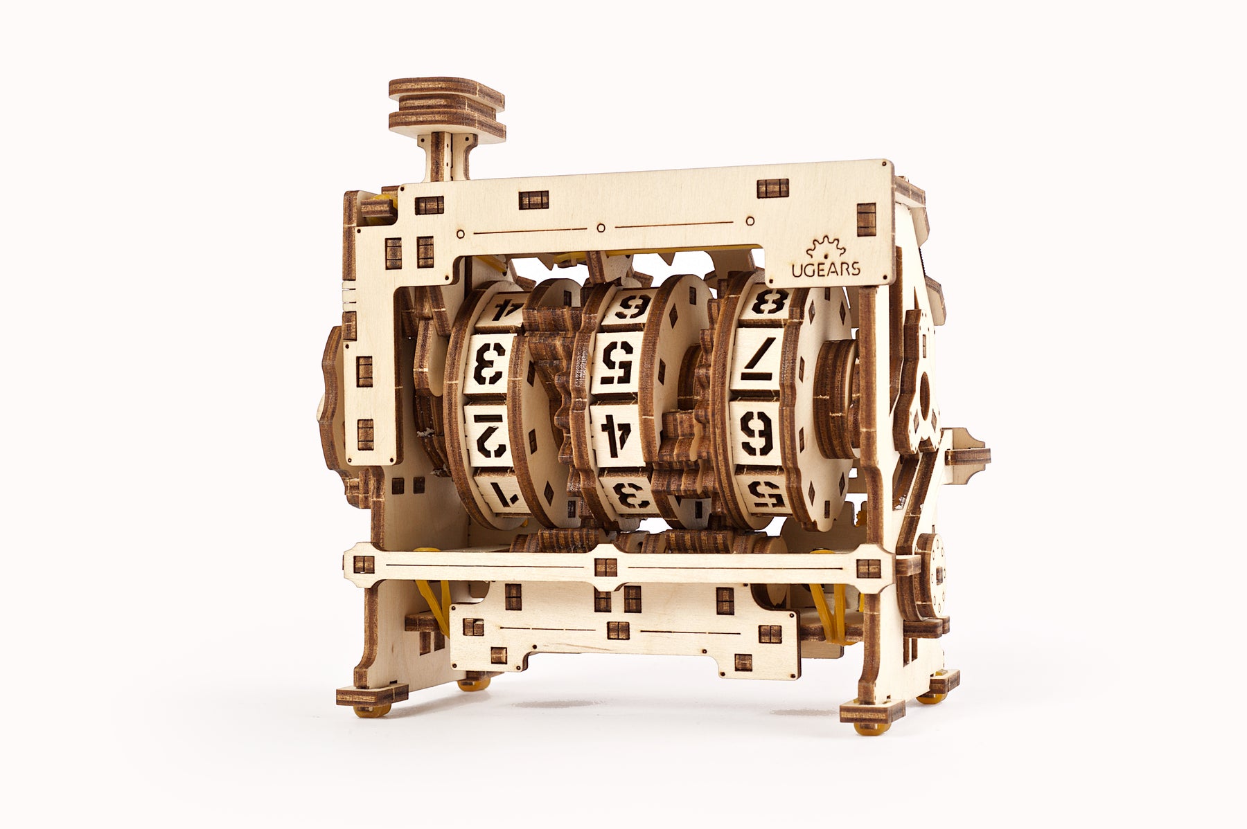 The counter registers repetitive actions. It is an integral part of a device called an "odometer". The model has three cylinder gears with numbers from 0 to 9 and a Maltese cross gear. This combination allows you to observe an interesting mechanical property: namely, how the stroke movement of the click button with the drive mechanism changes into the rotary movement of the cylinder gears with numbers.The counter offers two possibilities for data acquisition: click button and a rotary handle. Pressing the button or turning the handle moves the counter one place. When the counter 9 passes, the Geneva cross gear catches the next register cylinder and adds it to the counter. In total, the three-digit display can register counter values from 1 to 999. You can open the front panel of the meter and reset it manually. Try to count steps on the way home. Or how many people you meet while walking through the park. How about counting the number of blue cars that pass your house in an hour? Count stairs: at home, at school or at a friend's house..